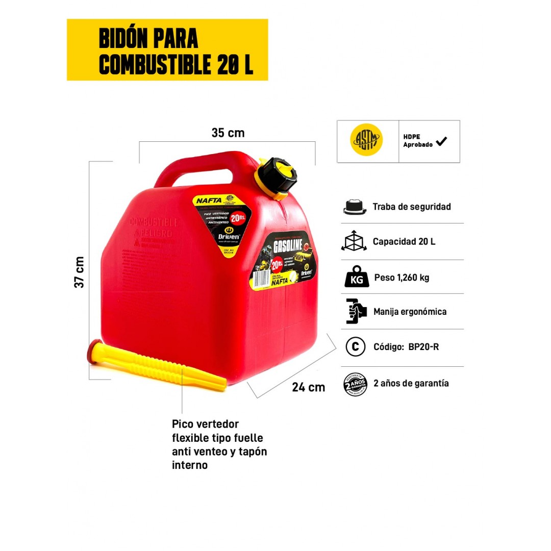 Bidón canadiense de 20 litros homologado para combustible y totalmente hermético. Carga permitida de nafta, gasoil y diesel en estaciones de servicio. Transporte seguro en ruta, no despide líquidos ni olores gracias a su traba de seguridad. En su interior se encuentra el pico vertedor a 45° con sistema de venteo que permite una salida fluida y continua del combustible. Incluye traba de seguridad, ideal para 4x4, aventuras, autos, motos, lanchas, grupos electrógenos.