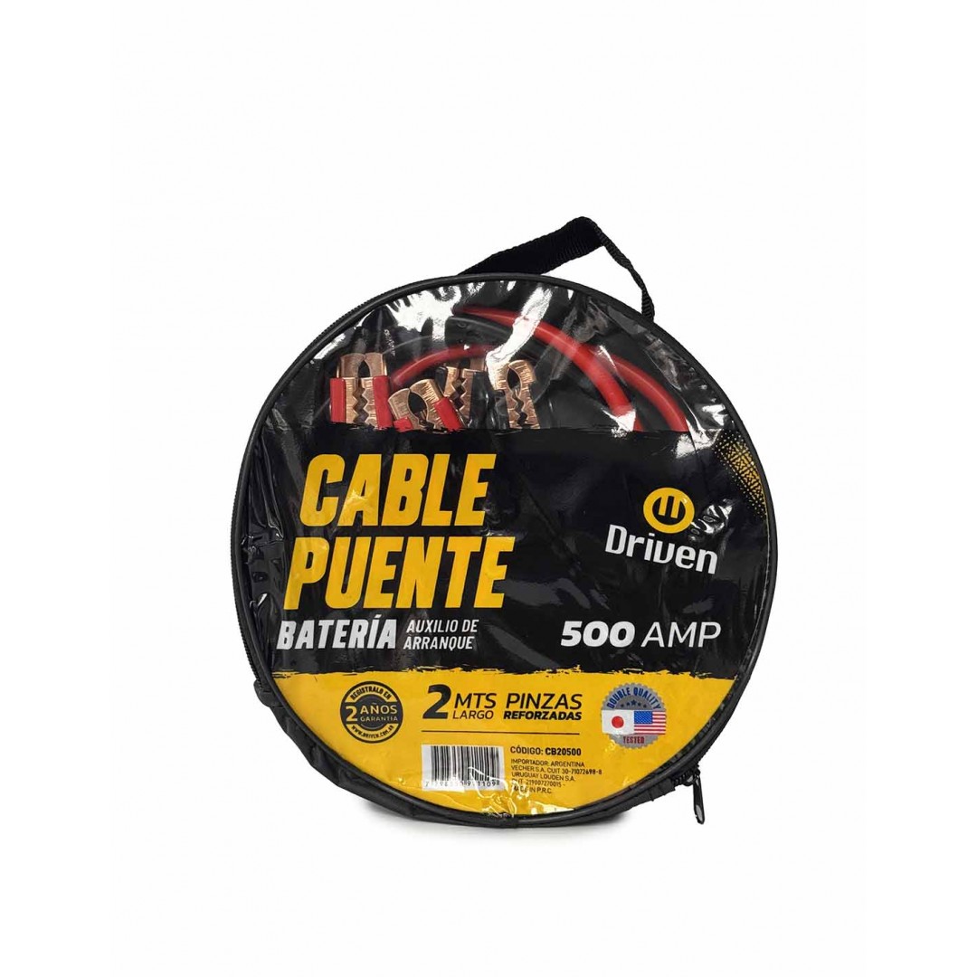 Juego de cables de arranque de batería para motos y autos de motor chico, de 500 amperes. Cable puente de muy buen grosor y cables rojo (+) y negro (-) para diferenciar las cargas. Ideal para auxilio rápido. Incluye bolso práctico para guardado y transporte.