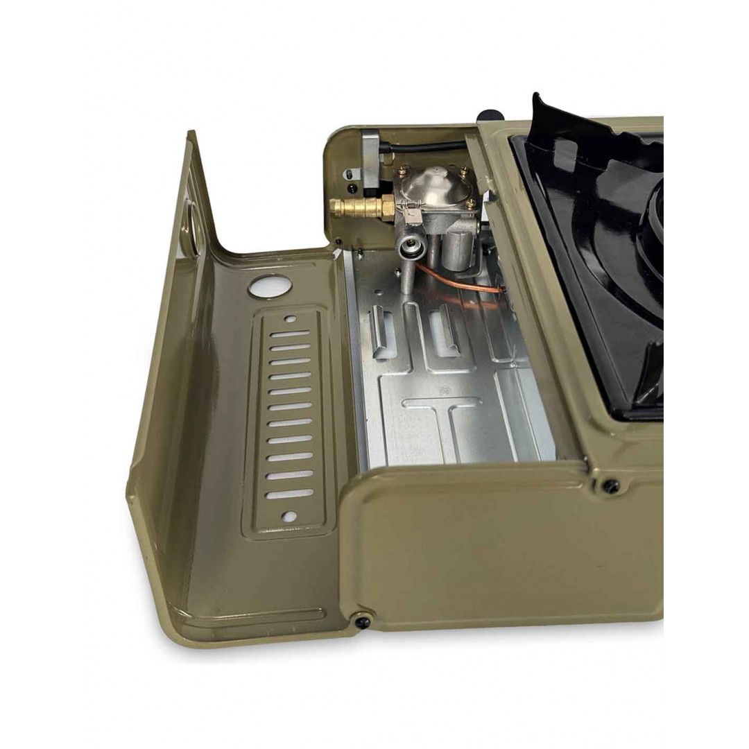 Cocina anafe a gas compacta resistente y portátil. Siempre lista para tus días de camping o actividades al aire libre. Con sistema de ajuste para regulación de llama. Incluye maletín de guardado para que su traslado sea practico y seguro.