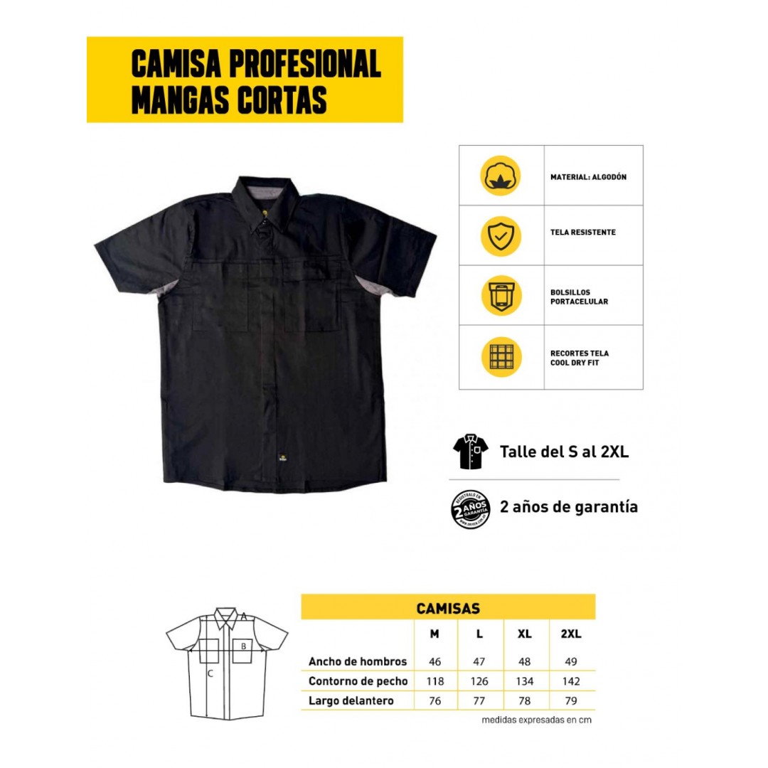 Camisa profesional mangas cortas, confeccionada con textiles resistentes de 100% algodón. Posee un bolsillo porta celular y recortes de tela Cool Dry Fit. Esta prenda con tejidos naturales permite el paso del aire y la evaporación del sudor, manteniéndote fresco, seco y cómodo.