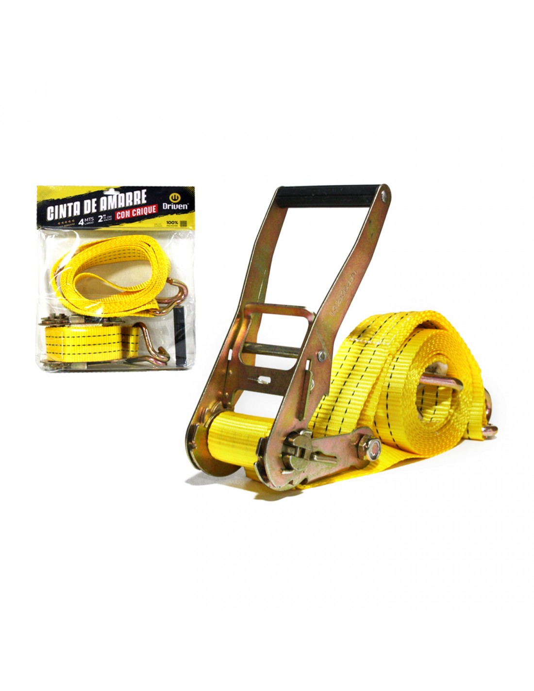Cinta de amarre con crique tensor “traka – traka” de 50 mm (2.0”) x 4 metros de largo. Incluye ganchos dobles metálicos J, super resistentes. Soporta un peso de hasta 3000 kg y es ideal para camiones. Se utiliza para sujetar cargas, transportar vehículos en remolques, como punto de apoyo y/o tensor de cargas.