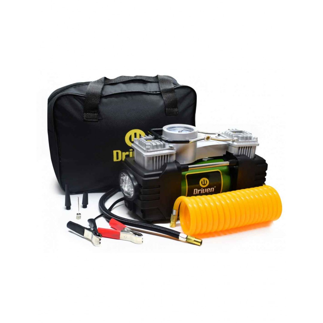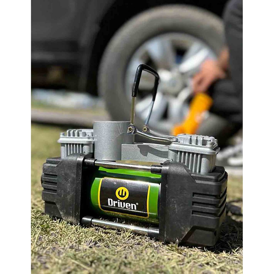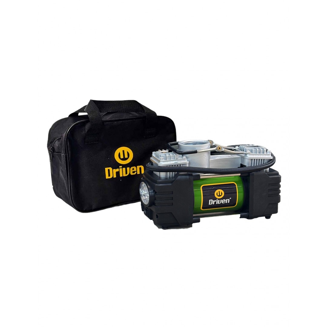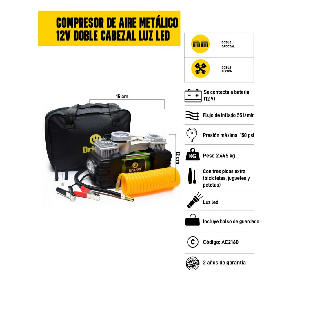 El compresor de aire metálico doble cabezal es ideal para medir la presión de tus neumáticos e inflarlos de manera rápida. De 12v, se conecta a la batería y posee una potente luz LED frontal para facilitar el trabajo nocturno o en zonas con poca visibilidad. Su estructura 100% metálica asegura una máxima durabilidad.
