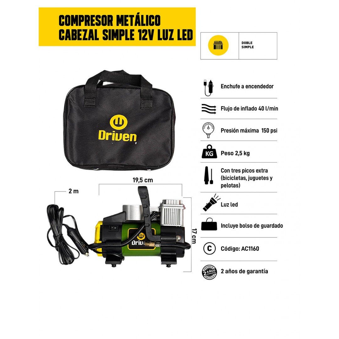 Información sobre el compresor metálico de aire para auto cabezal simple 12v luz led