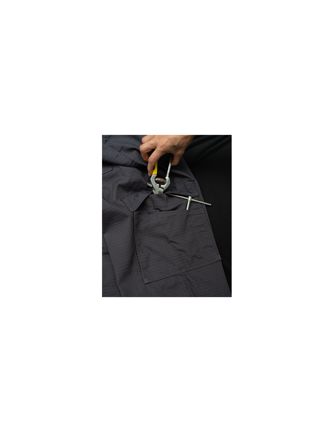 Pantalón profesional cargo Driven color gris, confeccionado en tela Ripstop antidesgarro, con ocho bolsillos amplios y funcionales.