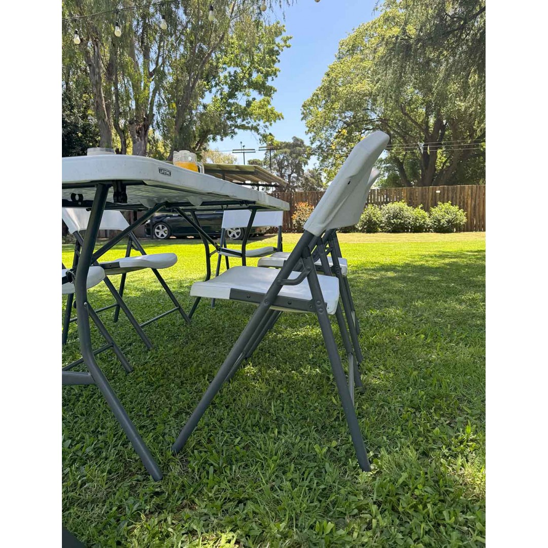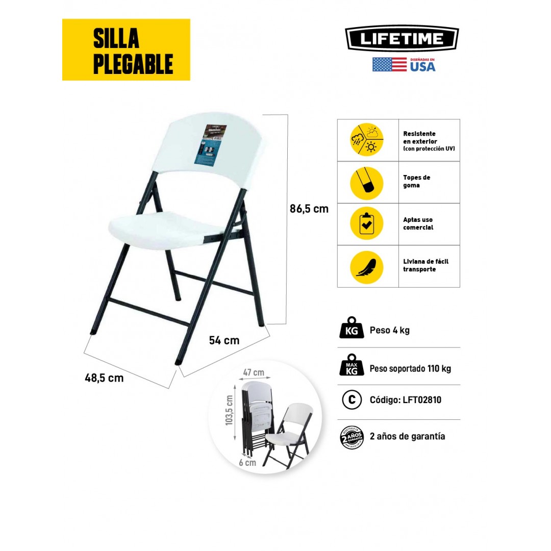 Cuenta con un sistema de fácil plegado y además, tiene incorporada un asa moldeada en la parte trasera del respaldo que permite transportarla de un lado a otro con facilidad. Es perfecta para completar una mesa plegable y requiere de poco mantenimiento.